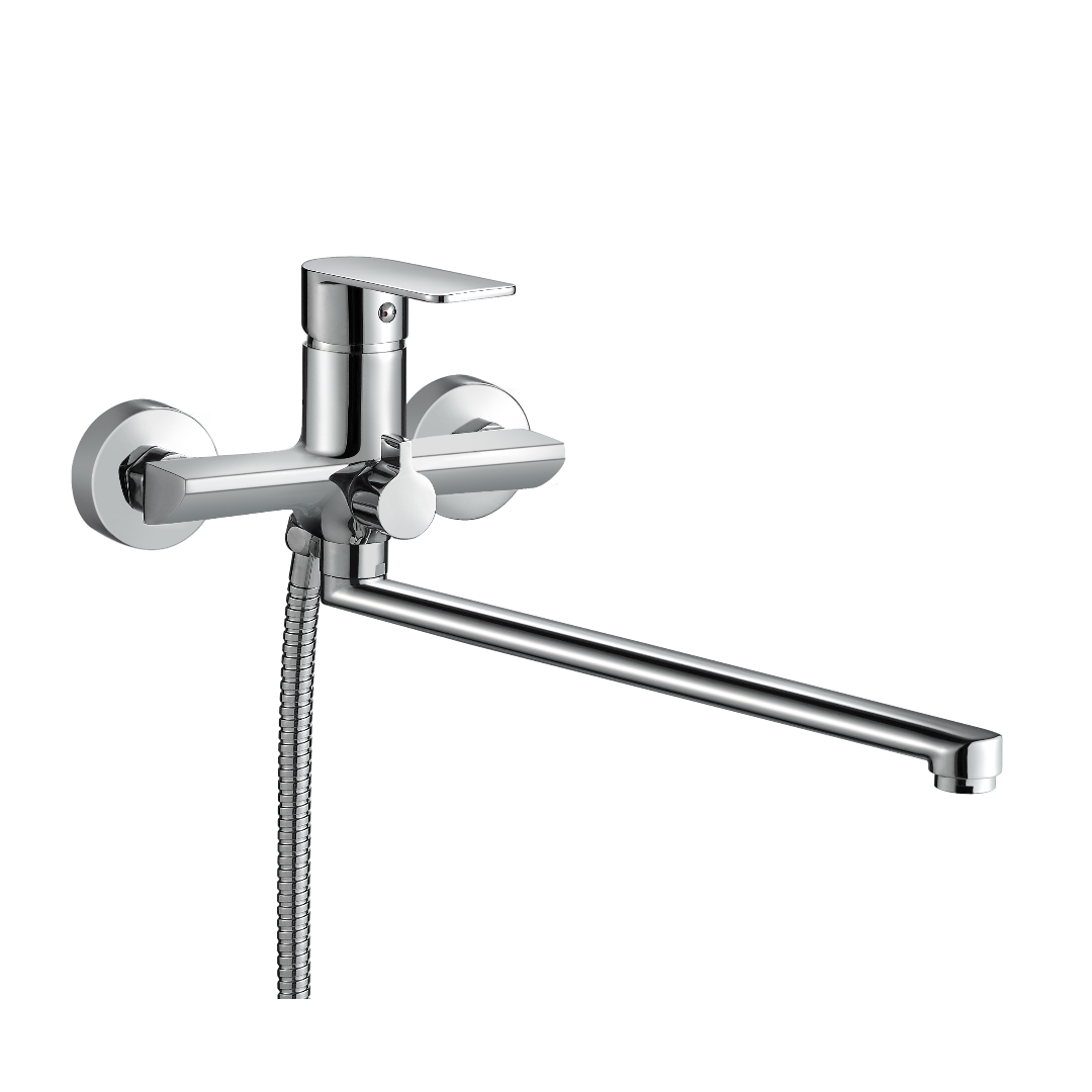 Смеситель для ванны с длинным изливом NENSA изготовлен из высококачественной латуни. Данный смеситель имеет однозахватную конструкцию, что позволяет легко и быстро настраивать температуру и напор воды одной рукой. Корпус смесителей изготовлен из прочной и долговечной латуни, а гальваническое покрытие обеспечивает стильный внешний вид и надежную защиту от коррозии. Переключение между режимами «душ» и «ванна» осуществляется легким поворотом переключателя. Длина излива составляет 350 мм, что обеспечивает комфортное использование и достаточный радиус действия.<br>